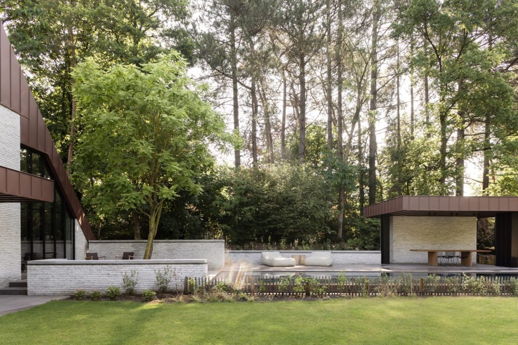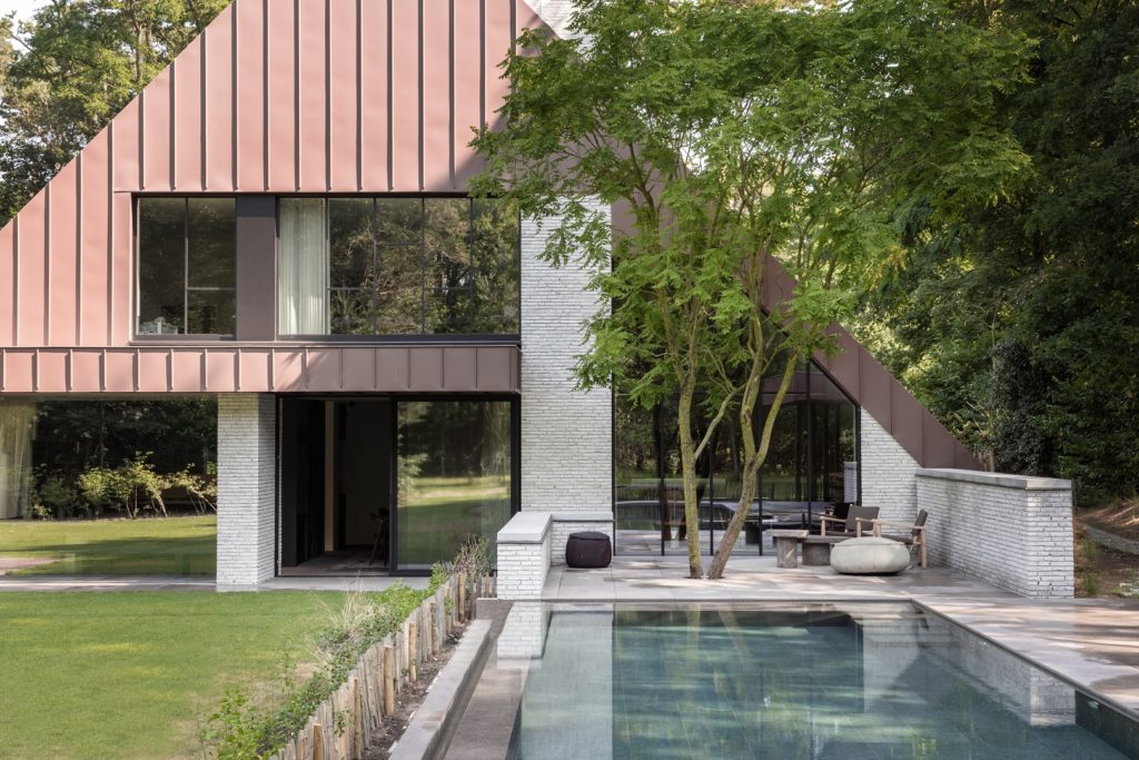 Deux médecins, désireux de s’installer dans le magnifique quartier boisé de Waasmunster (Belgique), ont contacté le cabinet d’architectes JUMA après l’acquisition d’une maison construite en 1987. Leur projet de rénovation comprenait davantage de chambres, un parking pour cinq voitures et une piscine extérieure. Mais surtout, ils souhaitaient une architecture contemporaine, en rupture avec le style désuet de la maison existante.