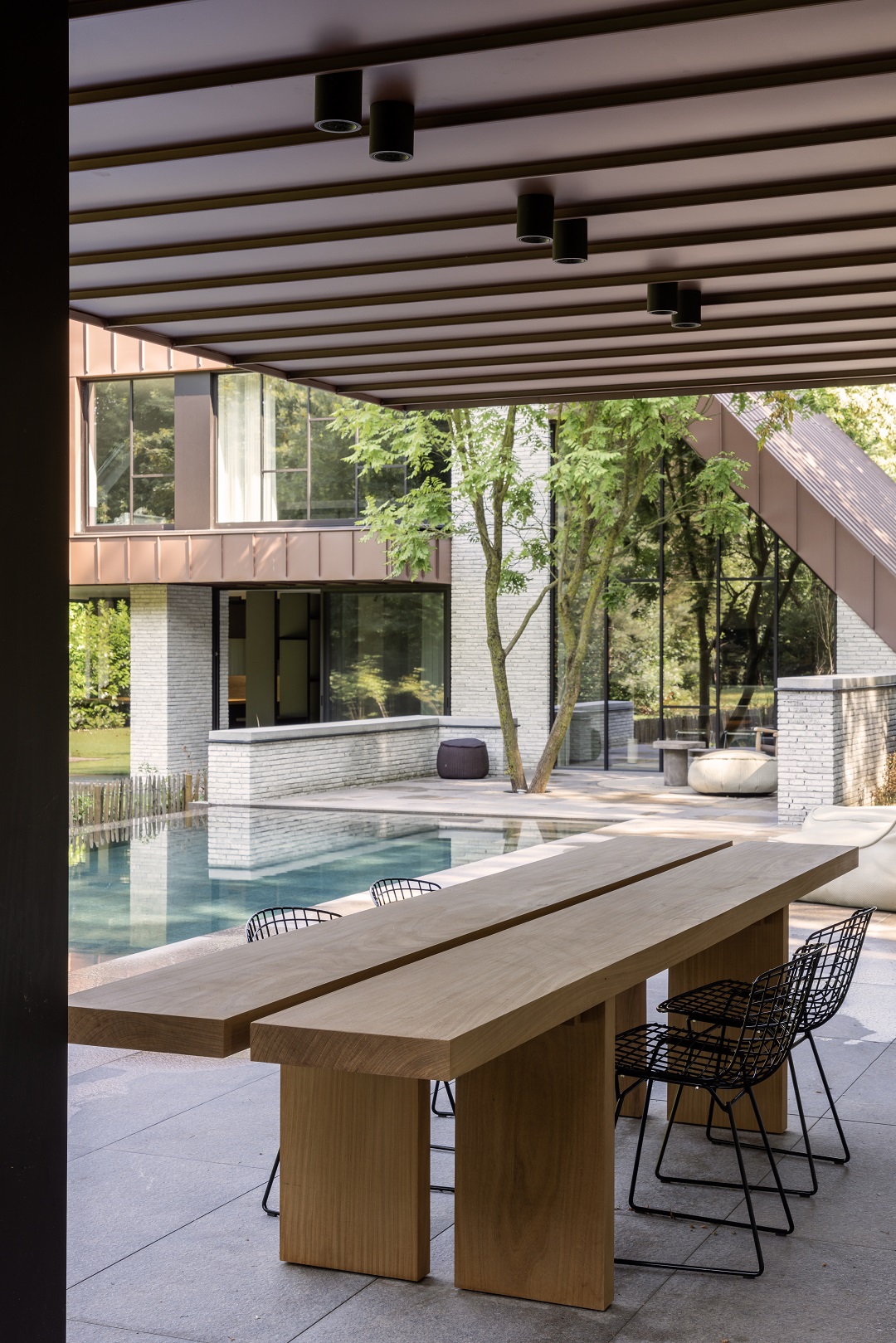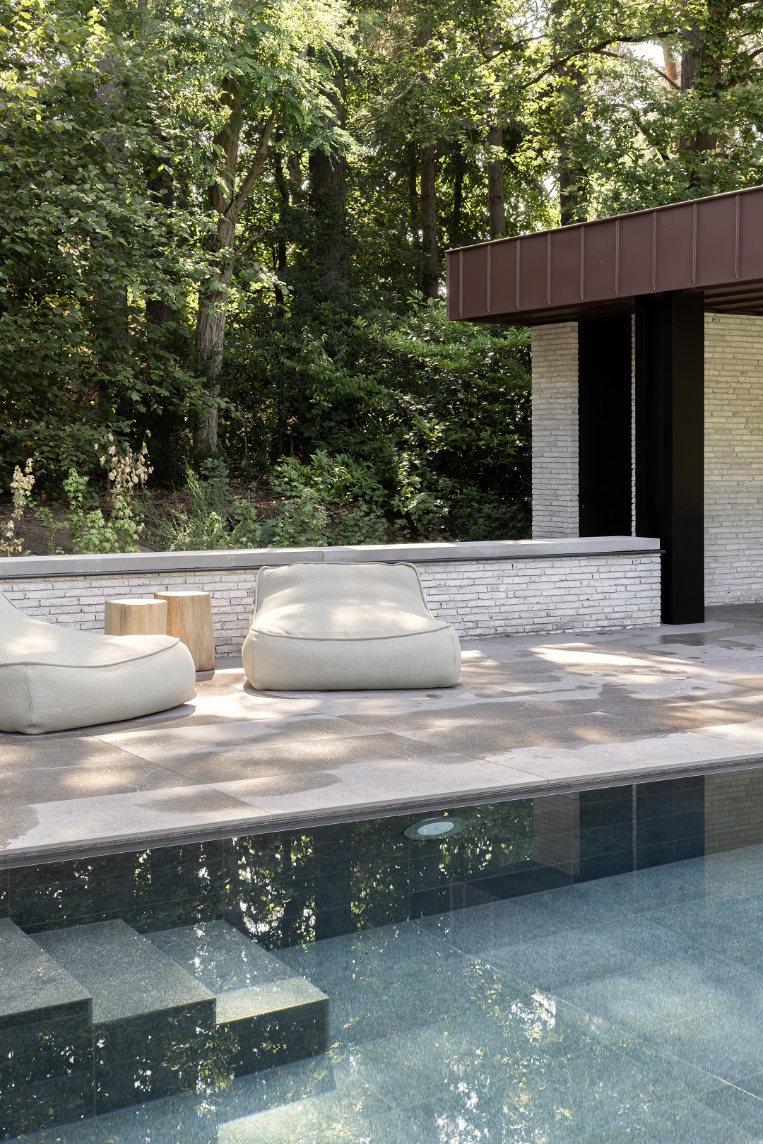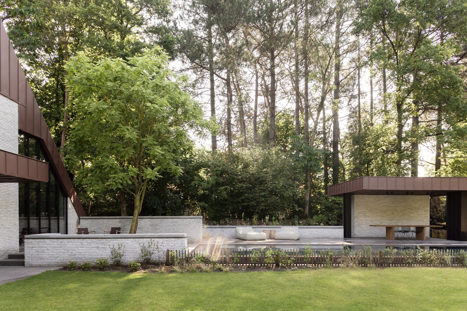 La piscine située à l’arrière a été surélevée pour optimiser l’ensoleillement. En effet, les grands arbres environnants ont tendance à bloquer la lumière du soleil assez tôt dans la journée. Au bout de cette piscine allongée, un pavillon a été construit afin que les habitants puissent profiter au maximum du plein air, à l’abri des intempéries. Ce pavillon a également été conçu pour s’intégrer harmonieusement aux autres volumes.