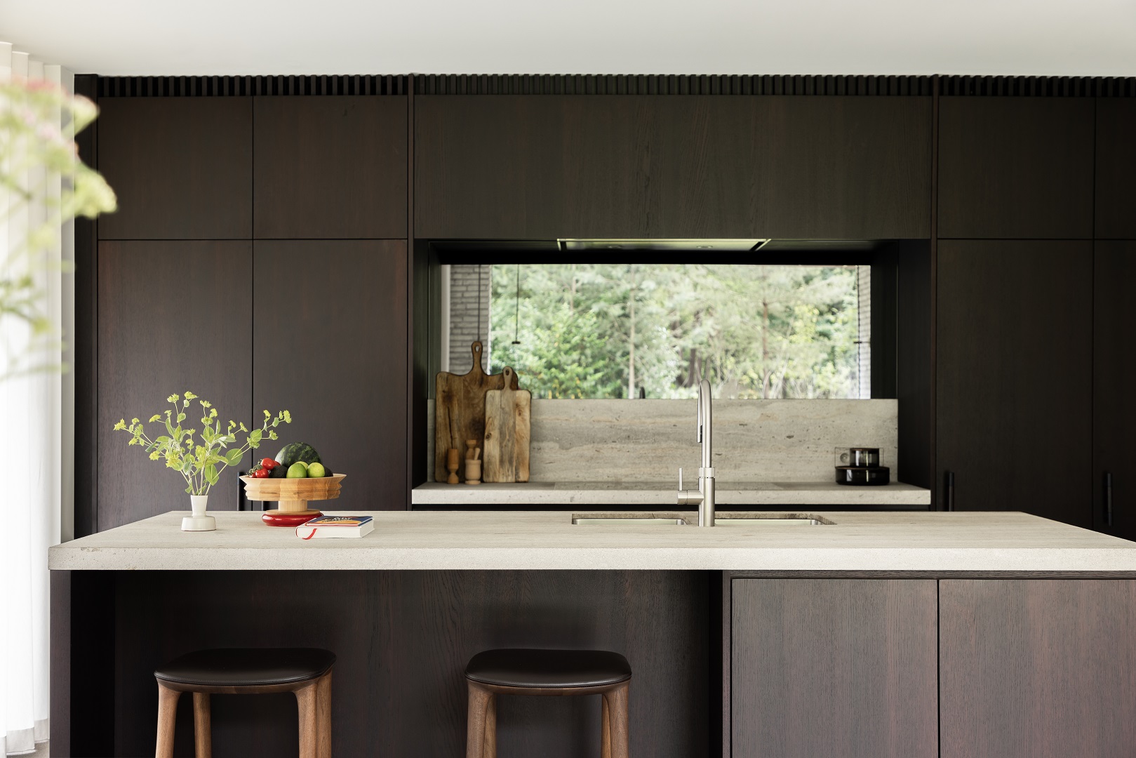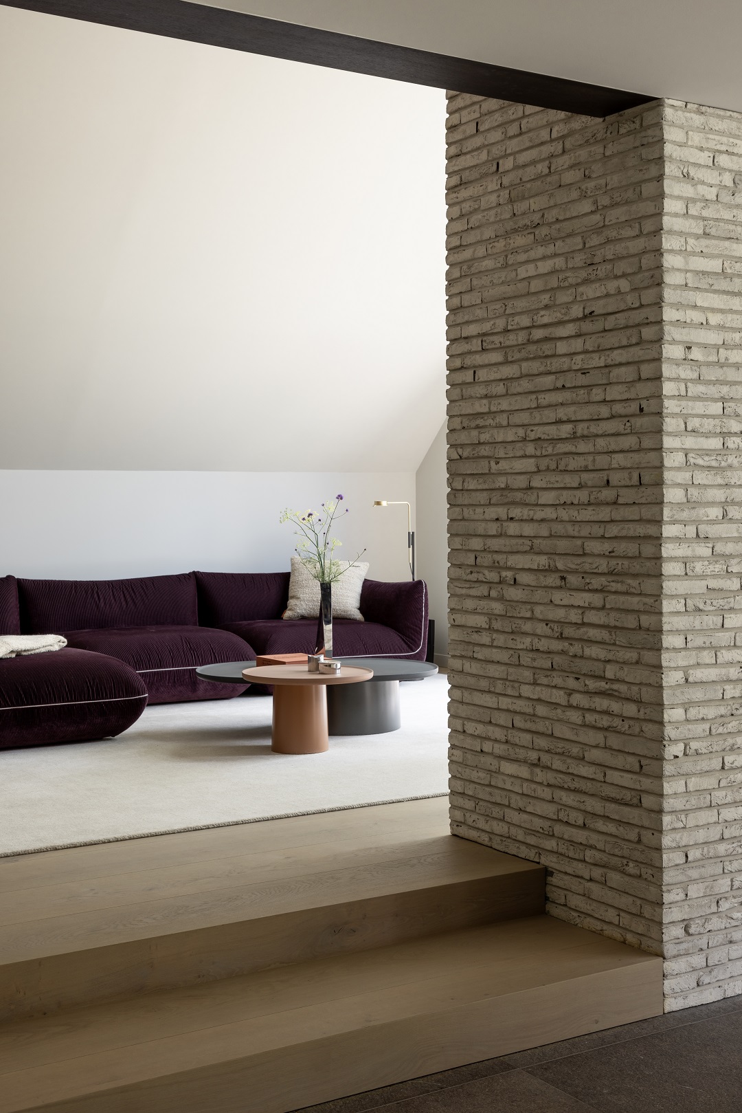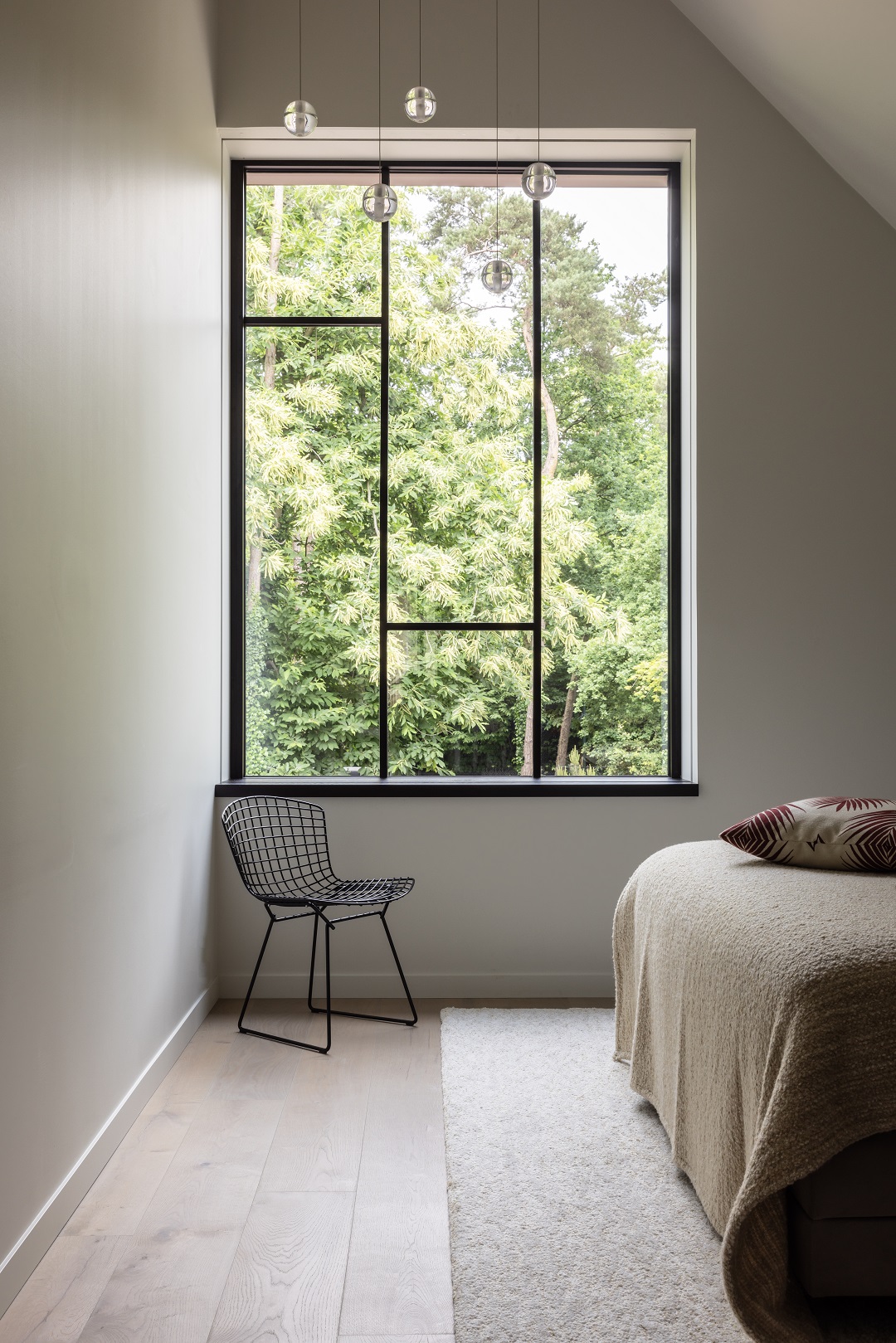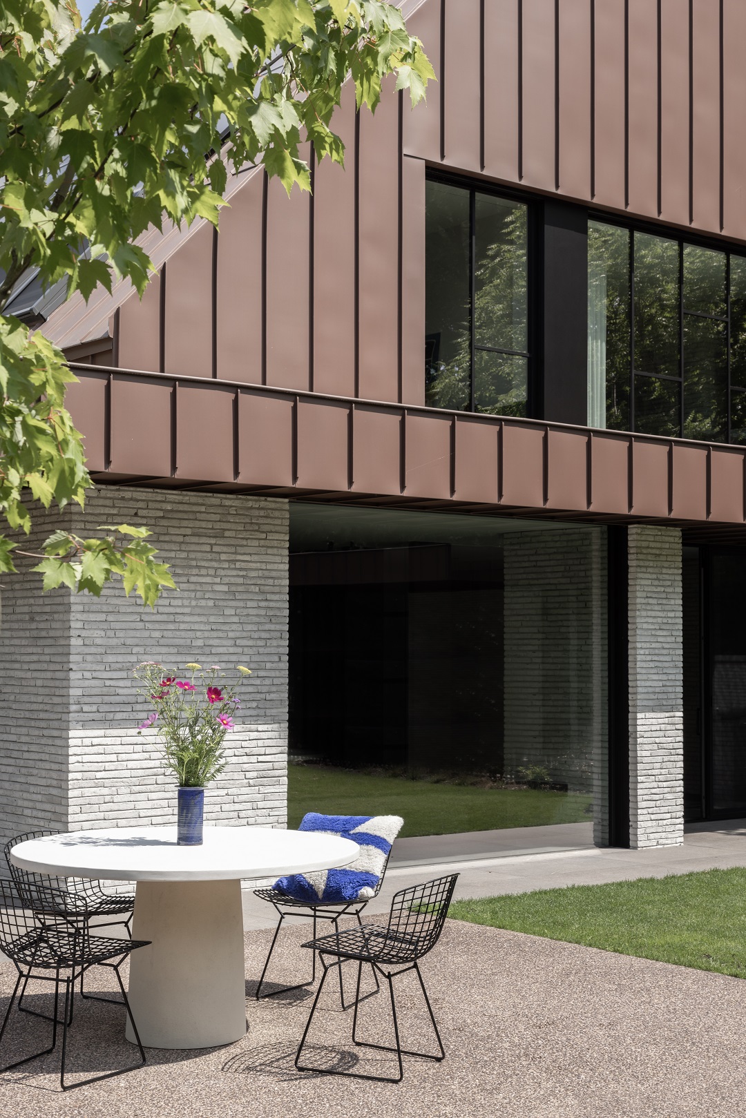 Afin de lui conférer un style plus contemporain, les arêtes de toiture existantes ont été coupées et la couverture remplacée par une tôle de zinc. Ce matériau a également été utilisé sur certaines façades, ce qui confère à la maison une esthétique sobre. Enfin, un nouveau parement en briques a été appliqué pour donner à la maison une allure moderne, en harmonie avec la nature environnante.